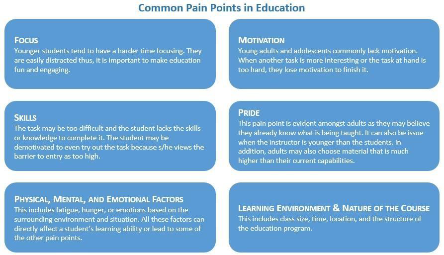 A pain point is defined as a factor that prevents a student from advancing through the learning program and/or achieving the objectives. Pain points can differ de- pending on the student’s age, background, or the field they are in. For example, the poor quality of assignments