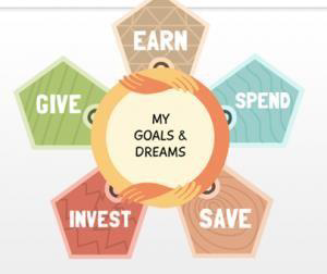dent can interchangeably learn the different aspects of: earn, spend, save, in- vest and give on a Dream-verse world. Students create an avatar called a Mini for themselves and are able to decorate their own planets with homes and other Minis. For example, the game starts off by teaching the student how to earn Moops by feeding Minis (earn) and then shows them how they then buy homes for the Minis (spend). For the saving aspect, it shows the user how to set a goal and gives examples of goals that other users are saving for in the ‘goal ma- chine’. The user is asked to input the following information when setting a goal: